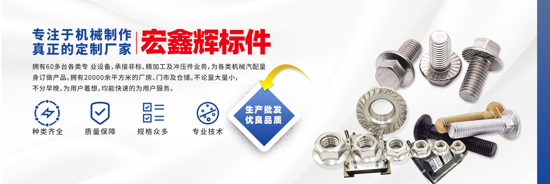 四川宏鑫輝標(biāo)準(zhǔn)件制造有限公司下設(shè):南充市宏輝機(jī)械制造有限公司,南充市聚宏機(jī)電設(shè)備有限公司,公司始建于1994年。為了拓展市場(chǎng),降低成本,本公司于2007年、2020年分別在南充、 成都、重慶創(chuàng)建了生產(chǎn)基地。擁有60多臺(tái)各類專 業(yè)設(shè)備,承接非標(biāo)、精加工及沖壓件業(yè)務(wù),為各 類機(jī)械汽配量身訂做產(chǎn)品。擁有20000余平方米的廠房、門(mén)市及倉(cāng)儲(chǔ)。公司以誠(chéng)信為本,竭誠(chéng)為廣大客戶提供服務(wù)。不論量大量小,不分早晚,為用戶著想,均能快速的為用戶服務(wù)。 公司所生產(chǎn)及代理的產(chǎn)品為業(yè)界人士公認(rèn)的國(guó)內(nèi)、國(guó)際優(yōu)等品牌。在產(chǎn)品性能與質(zhì)量